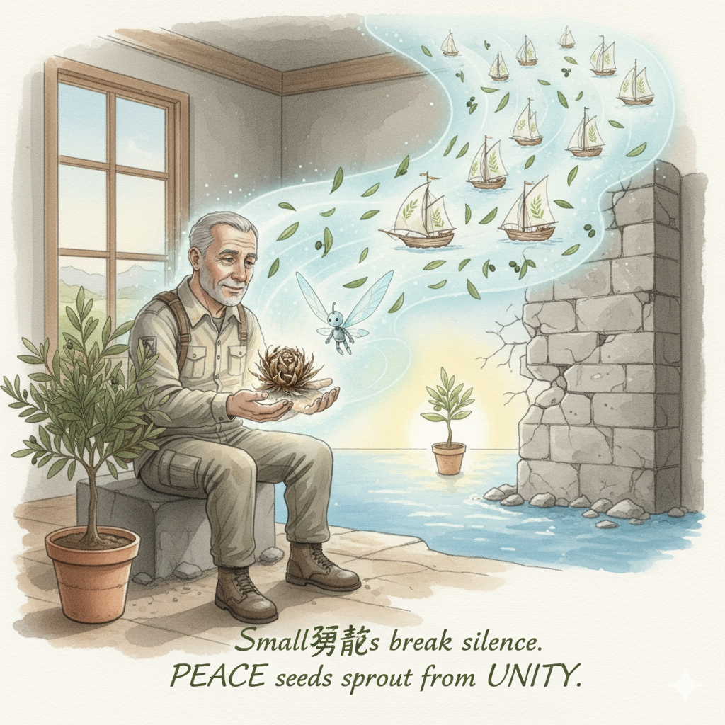 “The important thing isn’t how much aid that fleet carries, Ergo. The most important thing is the ‘truth’ and ‘message’ it carries: the courage not to be silent, and the heart of solidarity sent to the marginalized.” Daniel quietly stroked the olive tree’s branch.